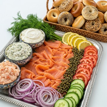 <p>An elegant display of freshly sliced smoked salmon beautifully placed on a tray with three types of cream cheeses, sliced red onion, capers, sliced plum tomato, sliced lemon, dill, cucumber and a tray of mini assorted bagels.</p>