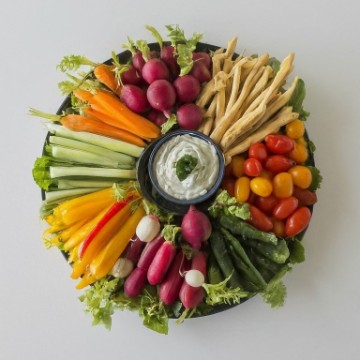 <p>Crispy fresh vegetables (broccoli, cauliflower, celery, peppers, carrots, cherry tomatoes and more). Complimentary with the platter is a choice of two of the following dips: mixed vegetables, sundried tomato, blue cheese, scallion with garlic or ranch dressing.</p>