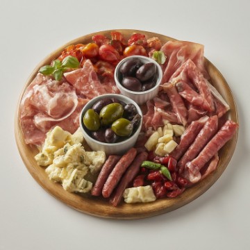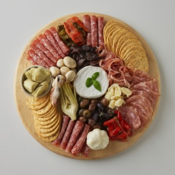 <p>A premier selection of imported and domestic old world meats and cheeses, including prosciutto di Parma, sopressata, garnished with olives, roasted peppers, garlic, tomato, mushroom, artichoke hearts, reggiano parmesan served with gourmet crackers or sliced French baguette on the side.</p>